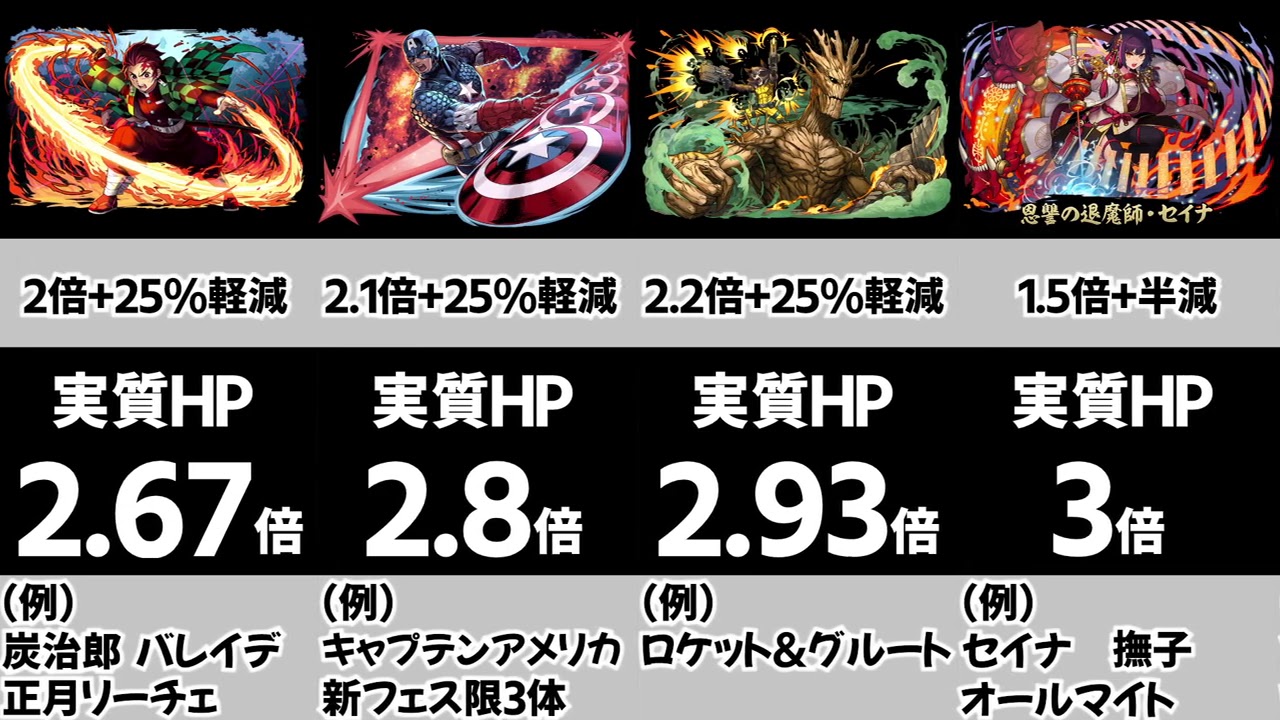 軽減の条件や回復力などもそれぞれ違うことから、一概にこれが耐久力最強とは決められないと考えたため、具体的な順位は付けずに今回は実質HP順に並べるだけにしました。